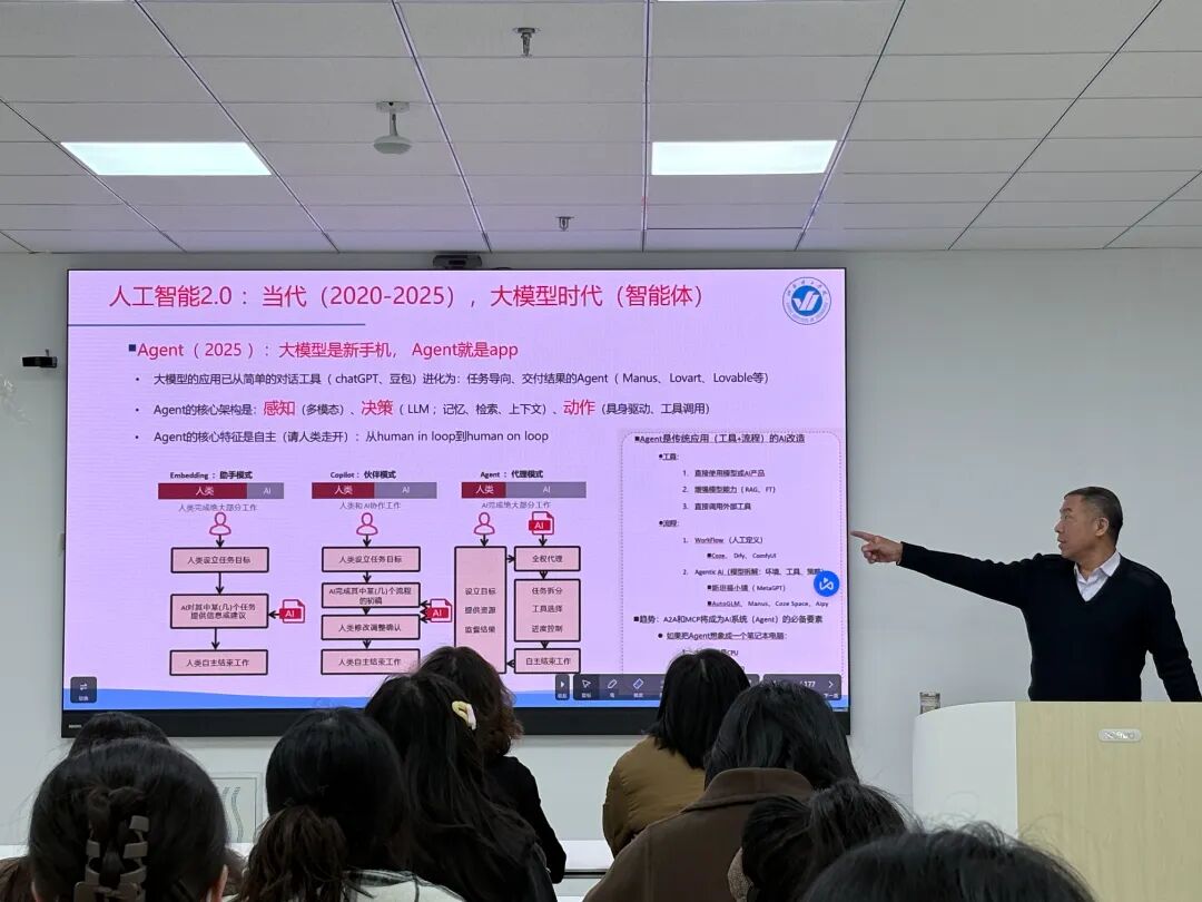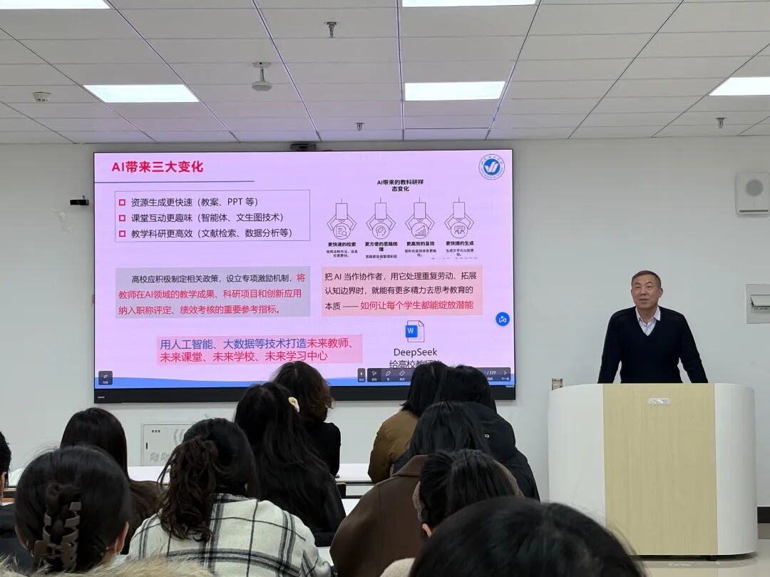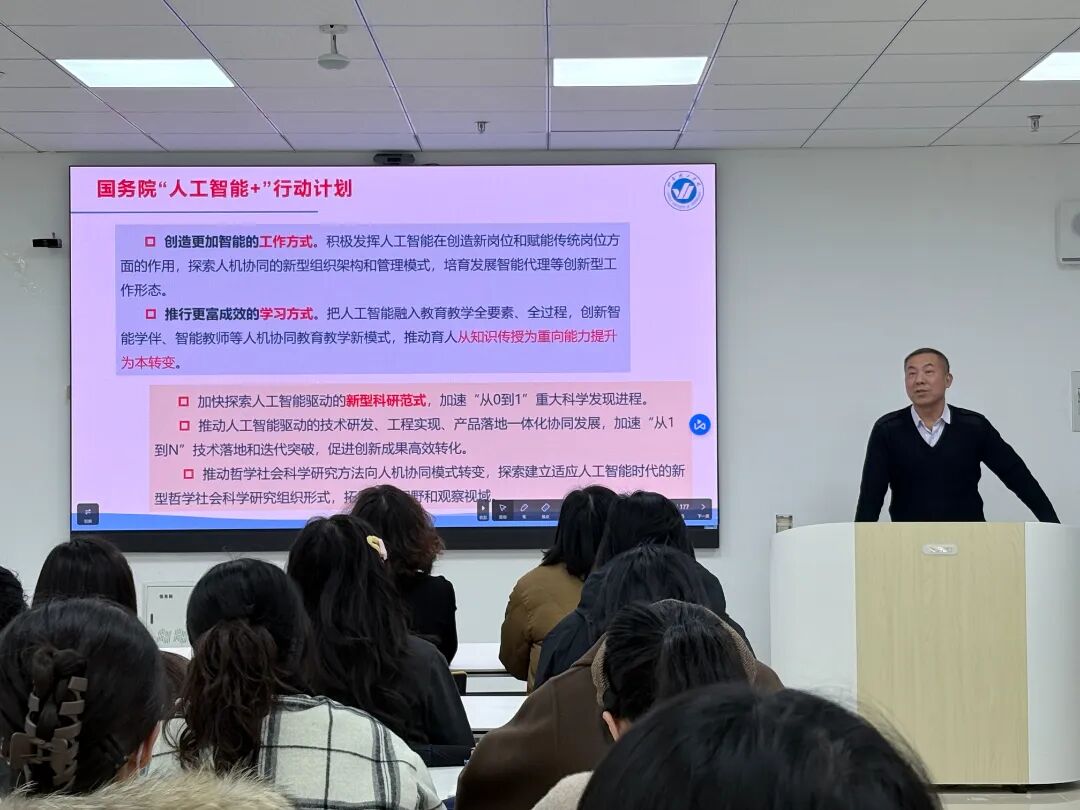 为推动人工智能与高校教学、科研工作深度融合,重构教学科研数字化范式,12月3日下午,文法学院于综合楼智慧教室S209成功举办“AI赋能教学科研的范式重构与行动路径”专题讲座。烟台理工学院人工智能学院院长、人工智能领域资深专家糜玉林教授受邀主讲,文法学院常务副院长林莎、副院长郭亚奇及全体教师参会,共同探索AI技术在文科教育领域的应用路径与实践方向。