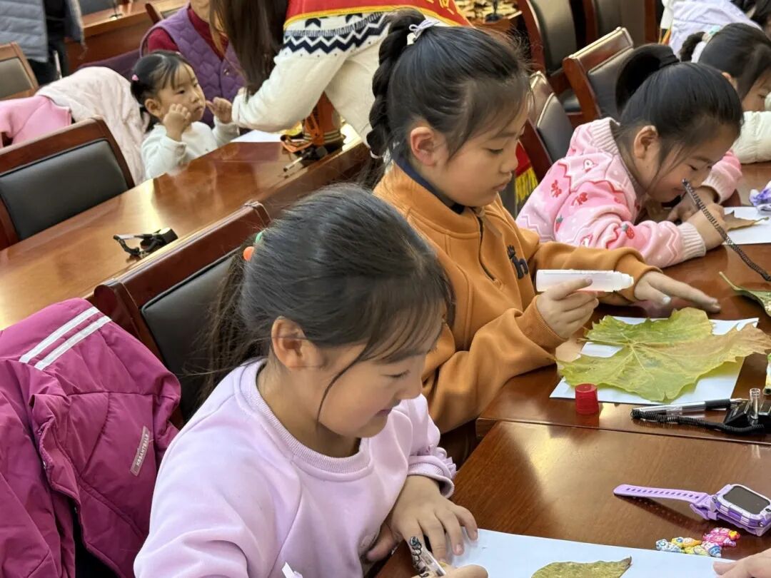 本次活动以绒花非遗文化的普及与手工实践为核心,设计了沉浸式的体验环节。活动现场,志愿者以“穿越时空的绒花”为主题,为孩子们讲述绒花从唐代起源、明清盛行到成为非遗的发展历程,并展示故宫藏品与大师作品,解读绒花的色彩密码与造型寓意;“趣味竞猜”互动中,孩子们通过问答与图案谜题,深化对绒花文化内涵的理解;手工实践模块分为自然材料拼贴、绒花DIY制作两类,孩子们或以落叶花草创意拼贴,或以扭扭棒亲手制花,近距离感知传统技艺的精巧匠心。活动最后,孩子们展示自己的作品并合影留念,志愿者也对大家的表现予以肯定与鼓励。